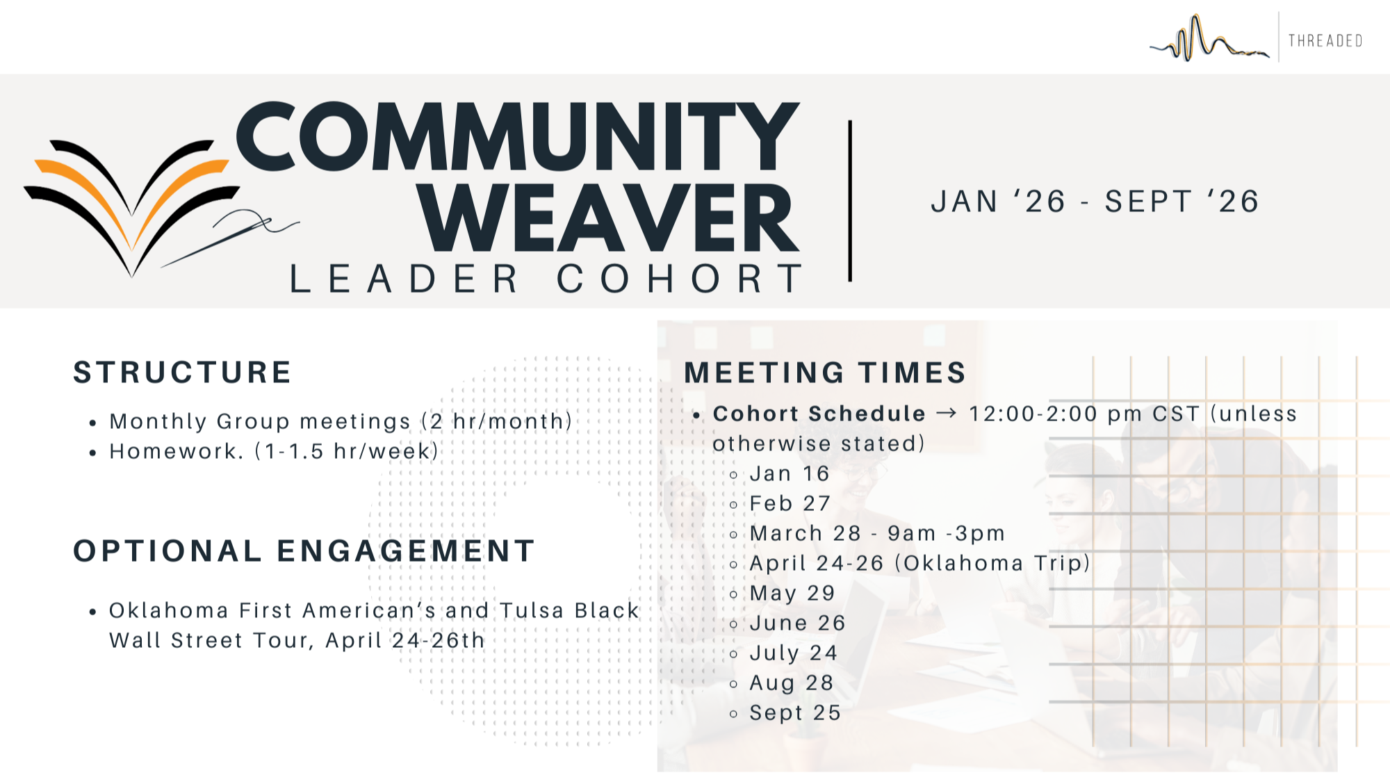 The cohort includes a monthly online group session, cultural intelligence training, an educational racial tour in Oklahoma, and targeted assignments and deliverables. By the end of the program, each participant will emerge as a certified Threaded Community Weaver Leader, fully prepared to engage in and contribute to their multicultural environments.